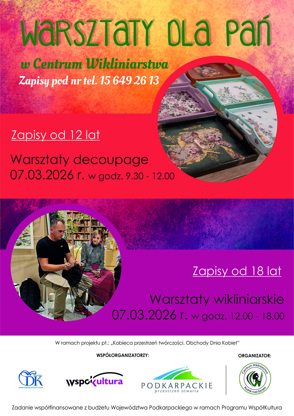 W ramach inicjatywy, realizowanej z okazji obchodów Dnia Kobiet, zaplanowano cykl wydarzeń o charakterze artystycznym i integracyjnym, skierowanych do kobiet w różnym wieku, zarówno młodszych, starszych, jak i kobiet z niepełnosprawnościami z regionu, oraz koncert otwarty dla wszystkich mieszkanek i mieszkańców gminy Rudnik nad Sanem. Całość działań odbędzie się w Centrum Wikliniarstwa, które stanowi przestrzeń sprzyjającą twórczej aktywności, wymianie doświadczeń oraz pielęgnowaniu lokalnych tradycji.