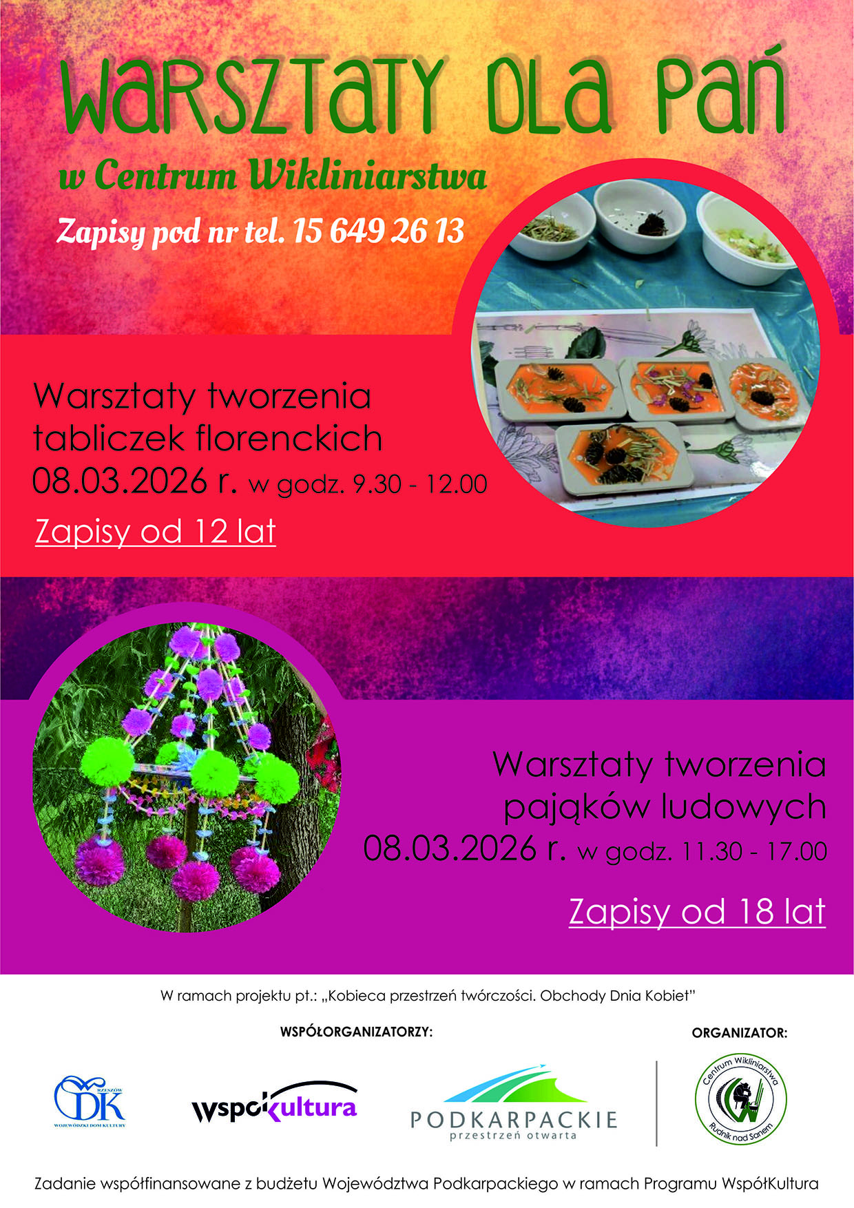 W ramach inicjatywy, realizowanej z okazji obchodów Dnia Kobiet, zaplanowano cykl wydarzeń o charakterze artystycznym i integracyjnym, skierowanych do kobiet w różnym wieku, zarówno młodszych, starszych, jak i kobiet z niepełnosprawnościami z regionu, oraz koncert otwarty dla wszystkich mieszkanek i mieszkańców gminy Rudnik nad Sanem. Całość działań odbędzie się w Centrum Wikliniarstwa, które stanowi przestrzeń sprzyjającą twórczej aktywności, wymianie doświadczeń oraz pielęgnowaniu lokalnych tradycji.