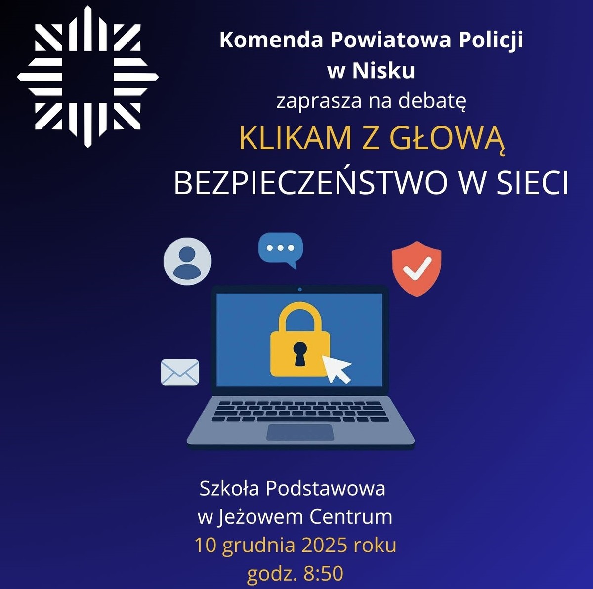 Komenda Powiatowa Policji w Nisku serdecznie zaprasza do udziału w debacie poświęconej świadomemu i bezpiecznemu korzystaniu z Internetu. Wydarzenie odbędzie się 10 grudnia 2025 roku o godzinie 8:50 w Szkole Podstawowej w Jeżowem Centrum.