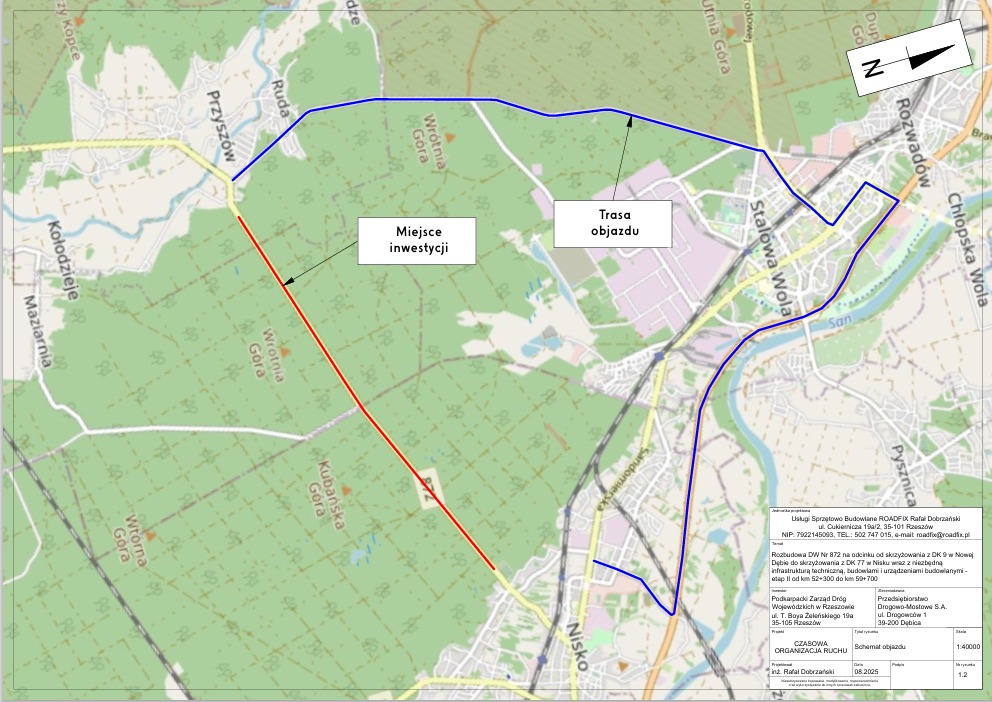 Na czas prac zamknięty zostanie odcinek DW 872 między Przyszowem a Niskiem, co wiąże się z koniecznością wprowadzenia objazdu. Trasa objazdu została wyznaczona przez Stalową Wolę i została oznaczona na mapie kolorem niebieskim. Odcinek objęty inwestycją oznaczono na czerwono.