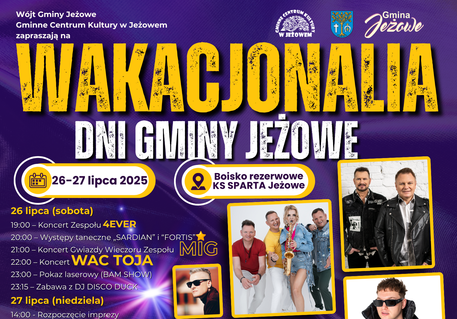Wójt Gminy Jeżowe oraz Gminne Centrum Kultury w Jeżowem serdecznie zapraszają mieszkańców oraz gości na Wakacjonalia 2025 – Dni Gminy Jeżowe, które odbędą się w dniach 26–27 lipca 2025 roku na boisku rezerwowym stadionu KS „SPARTA” Jeżowe.