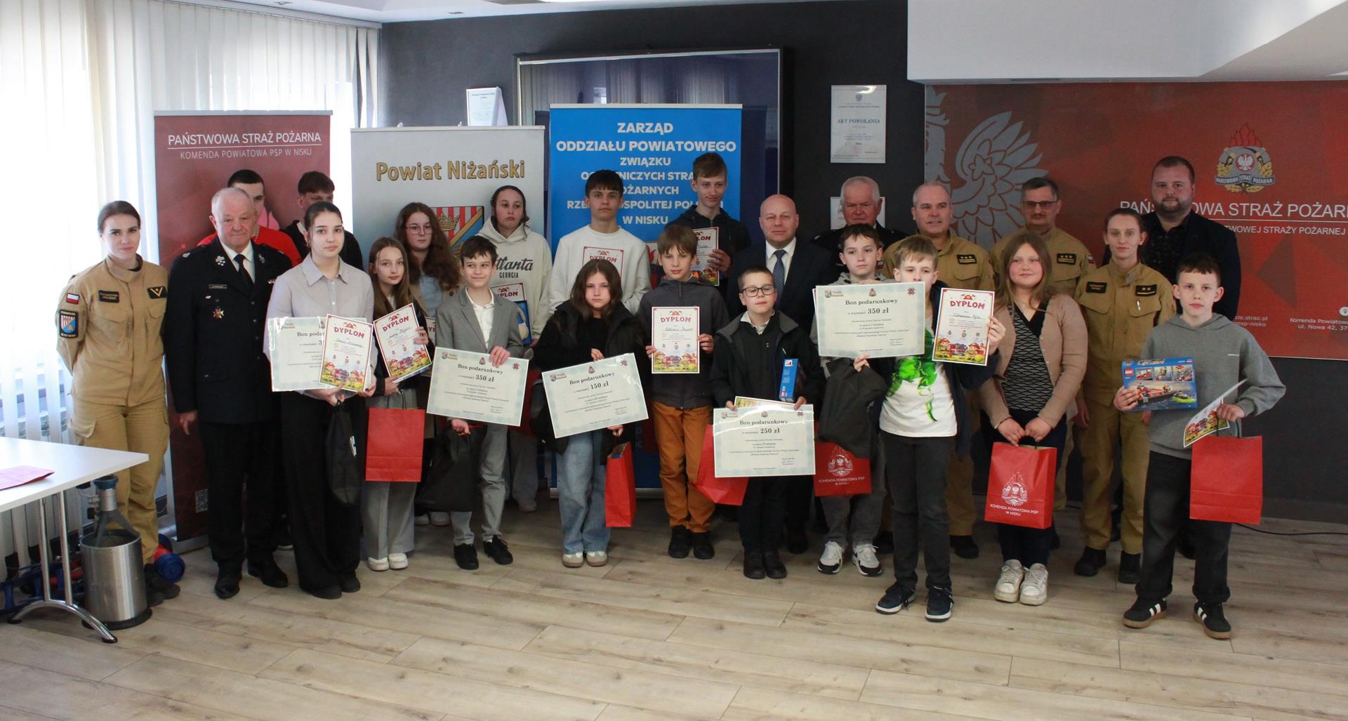 Wręczenia dyplomów i nagród rzeczowych ufundowanych przez Powiat Niżański oraz Oddział Powiatowy ZOSP RP w Nisku dokonali Starosta Niżański Robert Bednarz, Komendant Powiatowy PSP w Nisku st. bryg. Andrzej Kołodziej, Z-ca Komendanta Powiatowego PSP w Nisku st. bryg. Ireneusz Szewczyk oraz Prezes Zarządu Oddziału Powiatowego ZOSP RP w Nisku dh Gabriel Waliłko.