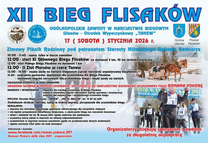 Ulanów po raz kolejny stanie się zimową stolicą narciarstwa biegowego. W sobotę 17 stycznia 2026 roku w Ośrodku Wypoczynkowym „Tanew” odbędzie się XII Bieg Flisaków – ogólnopolskie zawody w narciarstwie biegowym połączone z Zimowym Piknikiem Rodzinnym.